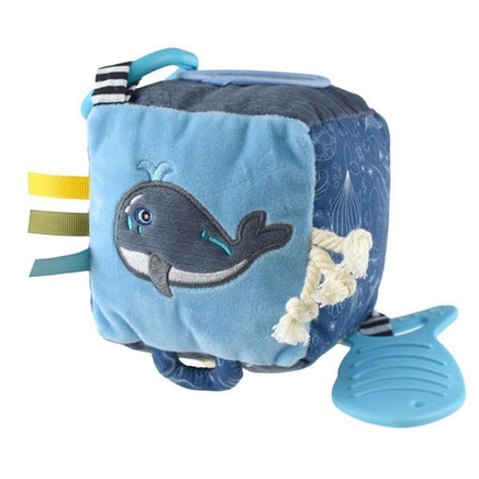 The Snuggle Buddy Whale Discovery Cube by Koala Dream is a soft, cute sensory cube with different activities on each side for babies to explore and discover.