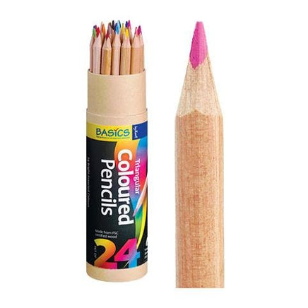 24 coloured pencils in a reusable cardboard tube. Triangular shaped for easy grip. 24 colours.