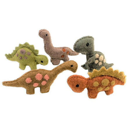 A lovely set of 5 felt dinosaurs in soft natural colours. Great for free play dioramas. Handmade in Nepal.