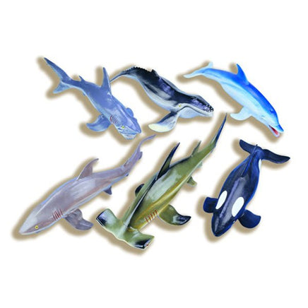 A set of 6 jumbo sized animal marine figurines. Figurines measure 48 to 56cm in length. Set includes humpback whale, killer whale, dolphin, hammerhead shark, blue shark and reef shark.