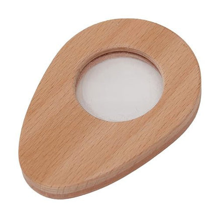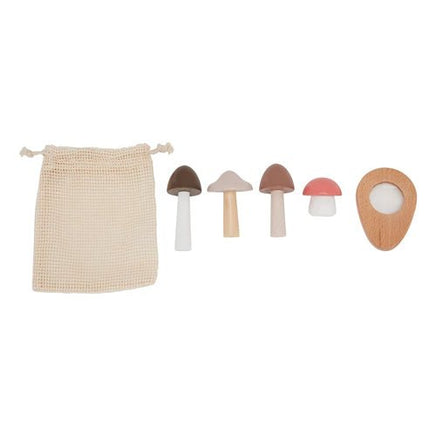 A set of 4 different beechwood mushrooms that can be used for sorting, counting or free play. Comes with a wooden framed magnifying glass. Includes heshian storage bag.