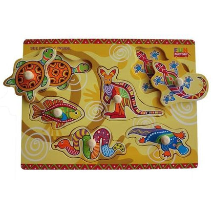 A chunky wooden knob puzzle that depicts Australian animals in an aboriginal design. Each puzzle piece has the image printed on the base to help find the correct place. Pegs on the puzzle pieces makes it easier to pulled out with their little hands This is a fun way to encourage learning.