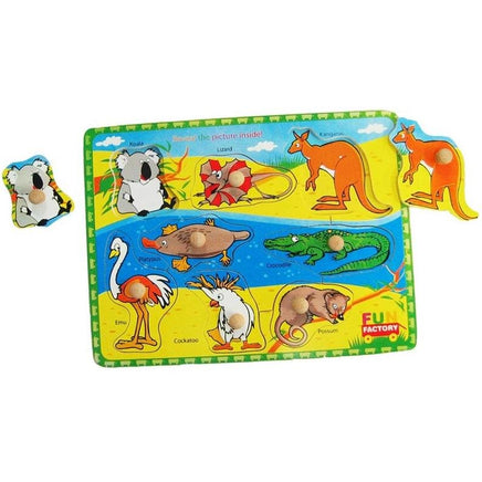 A chunky wooden knob puzzle that depicts Australian animals. Each puzzle piece has the image printed on the base to help find the correct place. Pegs on the puzzle pieces makes it easier to pulled out with their little hands This is a fun way to encourage learning.