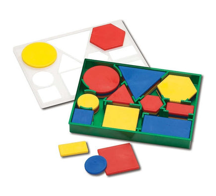 A wonderful manipulative to aid in classification, congruent vs. similar, fractions, proportions, comparing, patterning and more. 60 piece set includes 5 shapes in 3 colors and 2 sizes with two degrees of thickness. Compartmentalized plastic storage box with lid that functions as a sorter. 3.8 cm to 7.6 cm