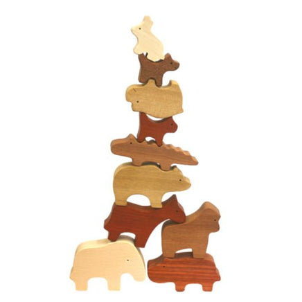 A wonderful set of 10 wooden animal shapes for stacking made from 4 different natural exotic woods such as teak, cherry, beech and safflower pear wood. The animals can be stacked to enhance fine motor skills and problem solving skills.
