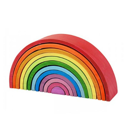 A wooden rainbow coloured rainbow. These colourful stacking semicircles rims form a lovely rainbow. Largest piece measures approx 35cm x 16cm x 7 cm. This rainbow looks and feels great and children enjoy using them in free play.
