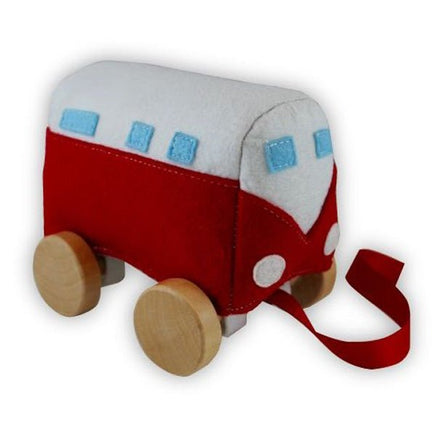 A quality felt kombi van from Discoveroo. Young ones enjoy pulling along this classic felt kombi with its wooden wheels. A small safety bell inside the toy rings as it rolls along!