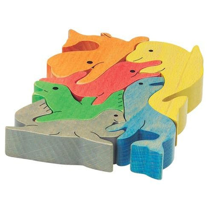 A sturdy colourful wooden balancing set of 6 dolphins. These dolphins can also fit into an interlocking puzzle. Great for enhancing problem solving skills and fine motor development. Also a lot of fun.