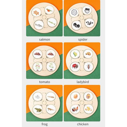 10 sets of 4 wooden discs that depict 10 different life cycles. Comes complete with a display board and a cotton storage bag. Each life cycle item has 4 life stages: For example (Apple -1. Seed 2. Sprout 3. Seedling, and 4. Apple Tree in Fruit). Sets include sunflower, frog, corn, chicken, turtle, spider, salmon, ladybird, tomato,