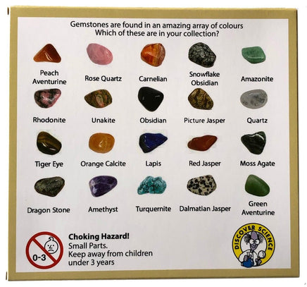 - Gemstone Collection Box includes: Rose Quartz, Amazonite, Red Jasper, Carnelian, Moss Agate, Picture Jasper, Unakite, Lapis, Turqernite, Dalmation Jasper, Dragon Stone, Tiger Eye, Snowflake Obsidian, Rhodonite and more.