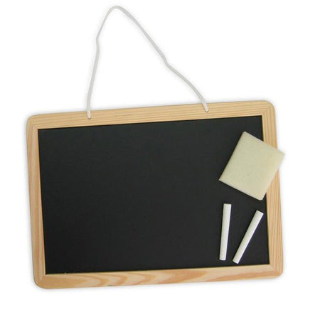 A small wooden framed black board (34cm x 24cm). Comes with sponge wipe and pack of 5 white chalks.