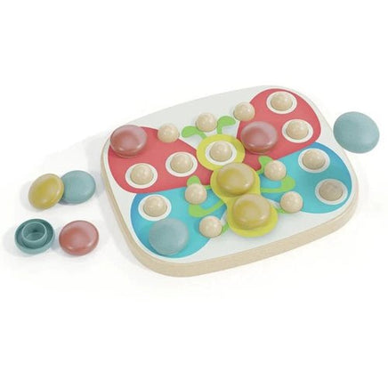 With this brand new green game, babies and children can play with coloured buttons to create their beautiful mosaics. The extra-large round buttons are easy to grip as they are specially designed to facilitate handling by younger children. They are available in different colours and can be easily adapted to small domes on the board. The top of the cards contains a series of images of patterns with funny and easily recognisable illustrations.