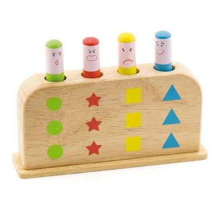 Wooden pop-up rods. Colourful rods that when you push them they spring up and out. The colourful rods slid into the matching coloured slots.. Slots are also labelled with numbers and shapes. Rods have different facial expressions. Very sturdy wooden box with concealed metal springs.