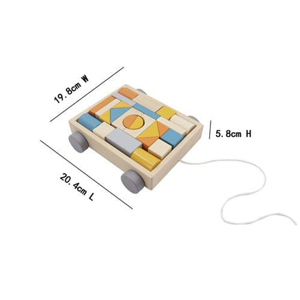 The Wooden Blocks and Pull Along Cart set from Kaper Kidz is a fantastic educational toy for children aged 18 months and up . The set comes with 25 assorted wooden blocks that are available in two colourways: pink/blue tones and yellow/blue tones . The blocks are made from high-quality wood and come in various shapes, including triangles, cubes, and round columns.