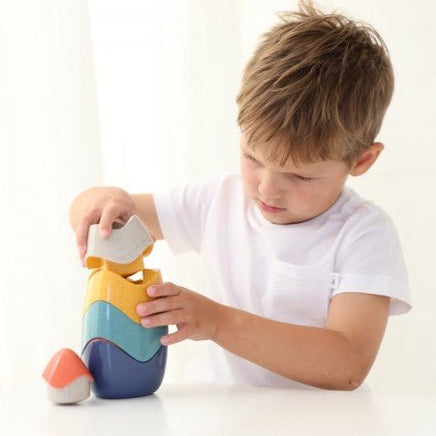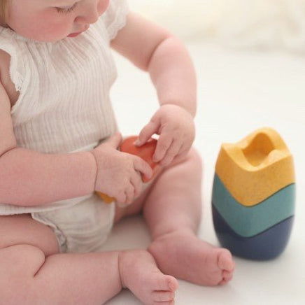An early learning toy with 5 interlocking stacking shapes (and connecting segments) that build to form an elliptical tower. Made from environmentally friendly wheat-fibre plastic. Develops fine motor skills, eye-hand coordination, and problem-solving.