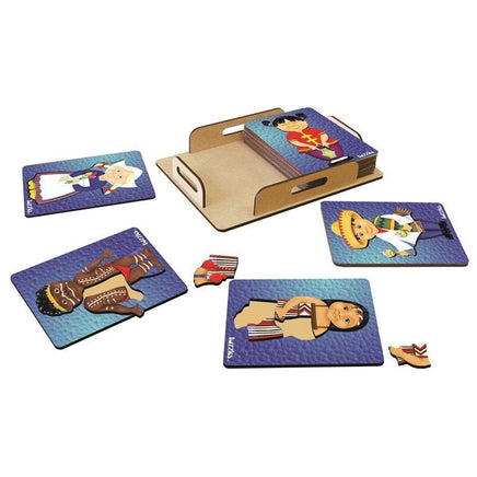 A set of 8 raised puzzles focussing on different national dress styles. Each puzzles has 6 pieces. Designed for preschoolers. Comes with a MDF for storage.