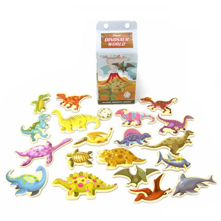 20 wooden dinosaur tiles with magnetic backing that come in a storage carton box.
