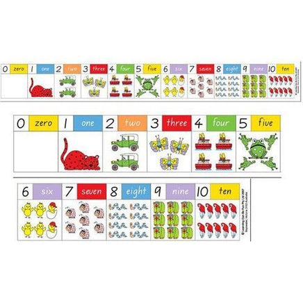 Classroom pack of 30 removable adhesive desk strips, showing numerals 1 to 10, numerals & letter formations plus a symbolic representation. Laminated for extra protection.