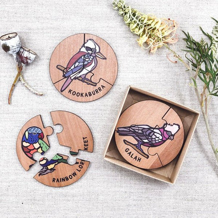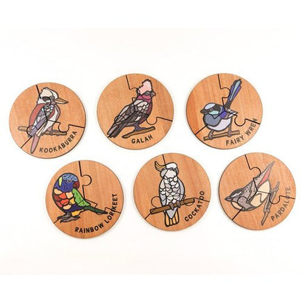 Australian Birds Jigsaw Set, featuring well known Australian native birds. Our sets of 6 mini jigsaws are packed in a recycled card gift box measuring 9.5 cm x 9.5 cm. Each puzzle is made from sustainably sourced Australian timbers, and are available in Myrtle, Blackwood or Tasmanian Oak. Every tree is different, therefore the colour and grain of timber varies, making each of our products unique. The real work has been done by the tree, we have added the craftwork.