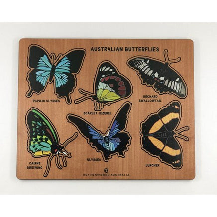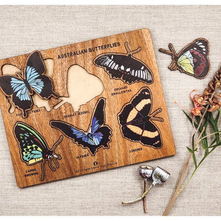 Australian butterfly puzzle, featuring well known Australian native butterflies. Lightweight, flat packed and wrapped for easy postage and travelling (size 25cm x 20cm). Each puzzle is made from sustainably sourced Australian timbers. Every tree is different, therefore the colour and grain of timber varies, making each of our products unique. The real work has been done by the tree, we have added the craftwork.