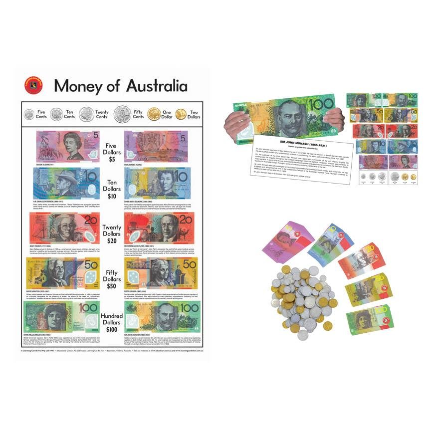 Educational pack for Australian Currency. Includes Take Note Pack (EV-LTNA), Australian Currency Wall Chart (EV-LMP) and our Money Pack (OZ-MNY). Take Note Pack is a set of 12 large (3 x normal) cards depicting Australian bank notes and information notes about them. Australian Currency Wall Chart is a wall poster showing all Australian coins and notes.