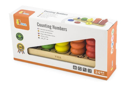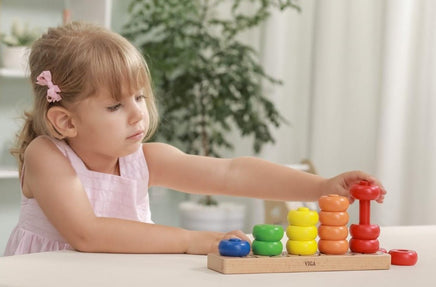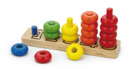 Wooden stacking ring which has number and colour match. A good basic tool for children to practice their colour and number matching skills.