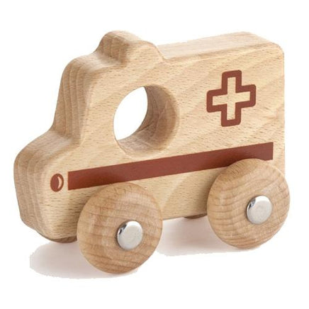 A set of 3 wooden emergency vehicles. Includes police car, fire engine & an ambulance.